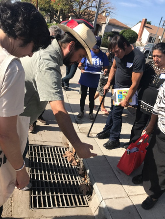 These included adding rain barrels, but also installing special water capturing strategy called “bio-swales” which is a creek-shaped structure made up of mulch, rocks, which will “slow it down, spread it out, and sink it in.” When asked about these strategies, Blanca Chavez, another East LA community leader that took the tour stated, “I loved the driveways some homes had that were designed, from my understanding, to slow down and capture water running off roofs.” She was talking about the permeable stone driveways that assist in the water conservation this project included.